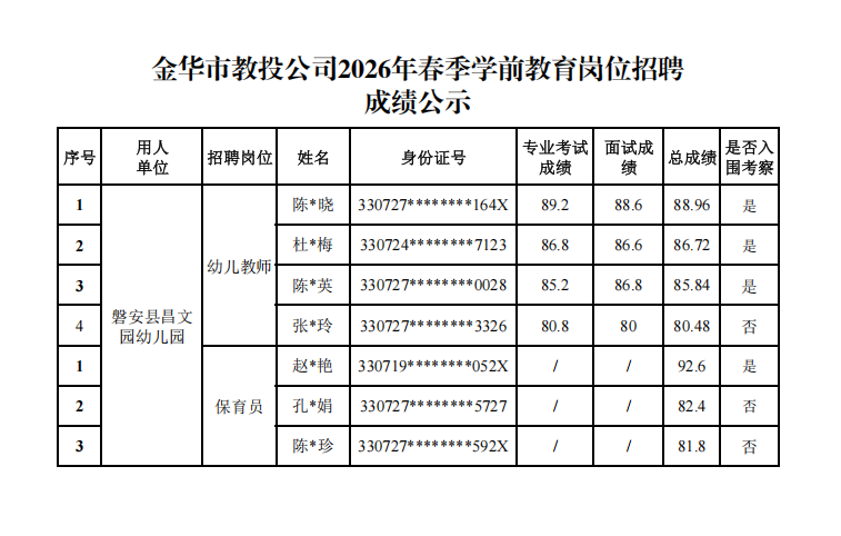 金华市教投公司2026年春季学前教育岗位招聘成绩公示